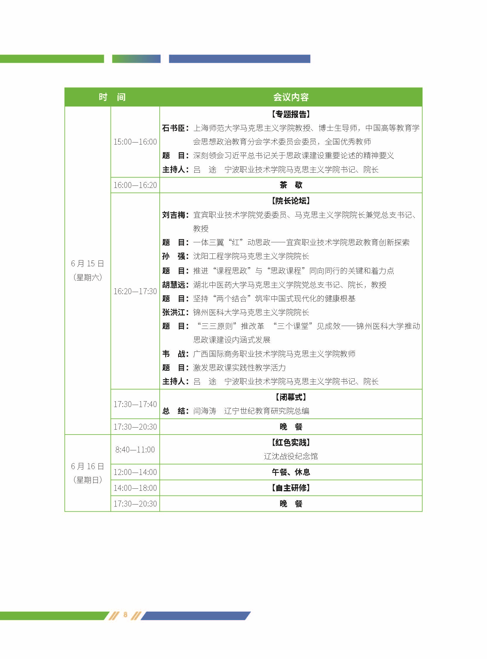 思政课建设内涵式发展创新研究、马克思主义学院建设高质量发展研究、办好“大思政课”实践路径研究、大中小思政教育一体化建设研究、“课程思政”与“思政课程”同向同行中的关键问题研究、主题实践研修(辽沈战役纪念馆)。